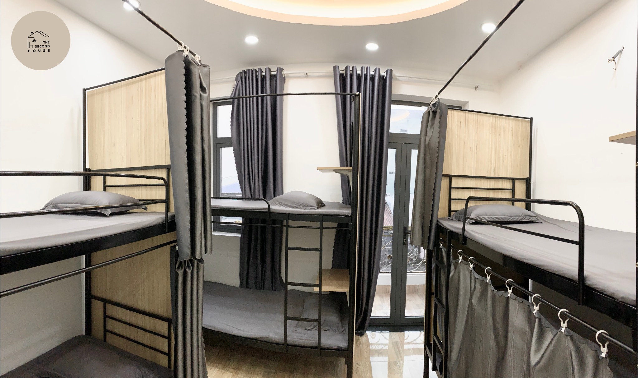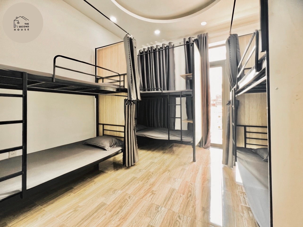 ✅ Giường 1×2 mét có sẵn nệm, ga, gối và rèm che riêng tư. Phòng nam nữ riêng biệt