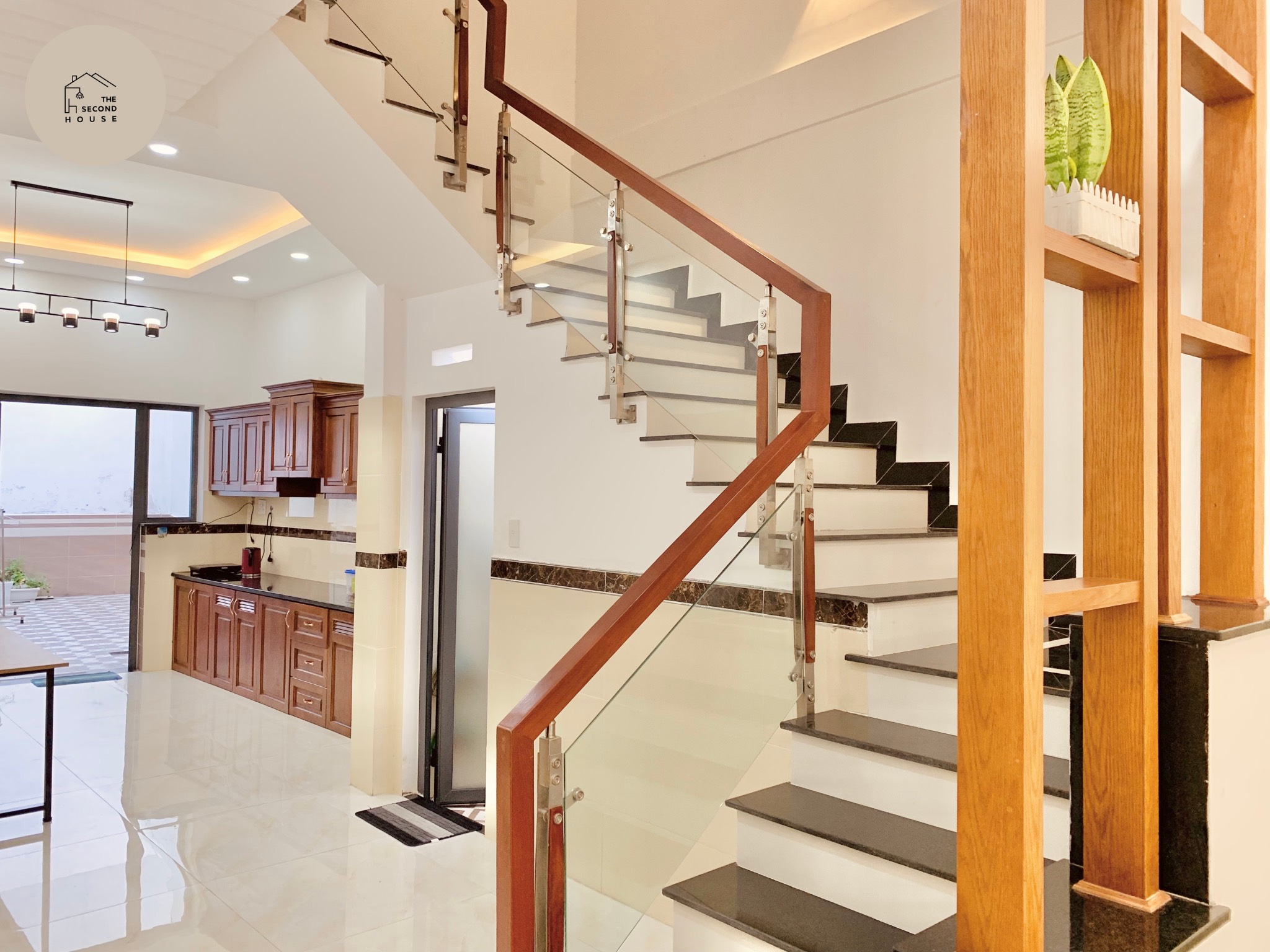 ✅ Khu vực bếp lớn nằm ở tầng trệt với tủ bếp gỗ lớn, bếp từ, ấm đun, tủ lạnh, nồi, chén, bàn ăn, ghế ngồi