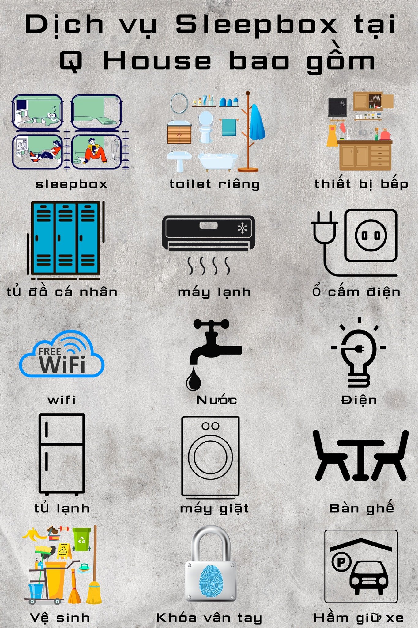 Ngoài ra Sleepbox của Q House đầu tư nội thất và trang thiết bị hoàn toàn mới, bao gồm: